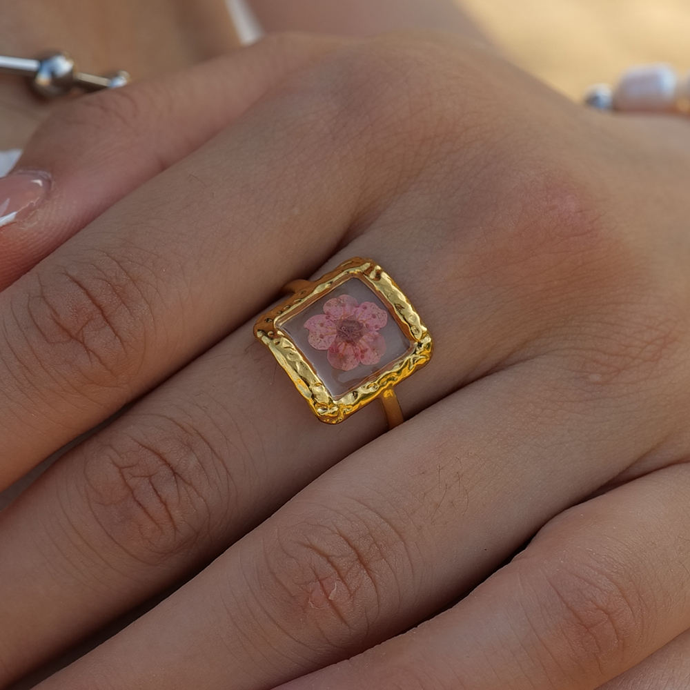 Delicate square open ring featuring a real colorful eternal plum flower. A charming and elegant statement piece for girls.