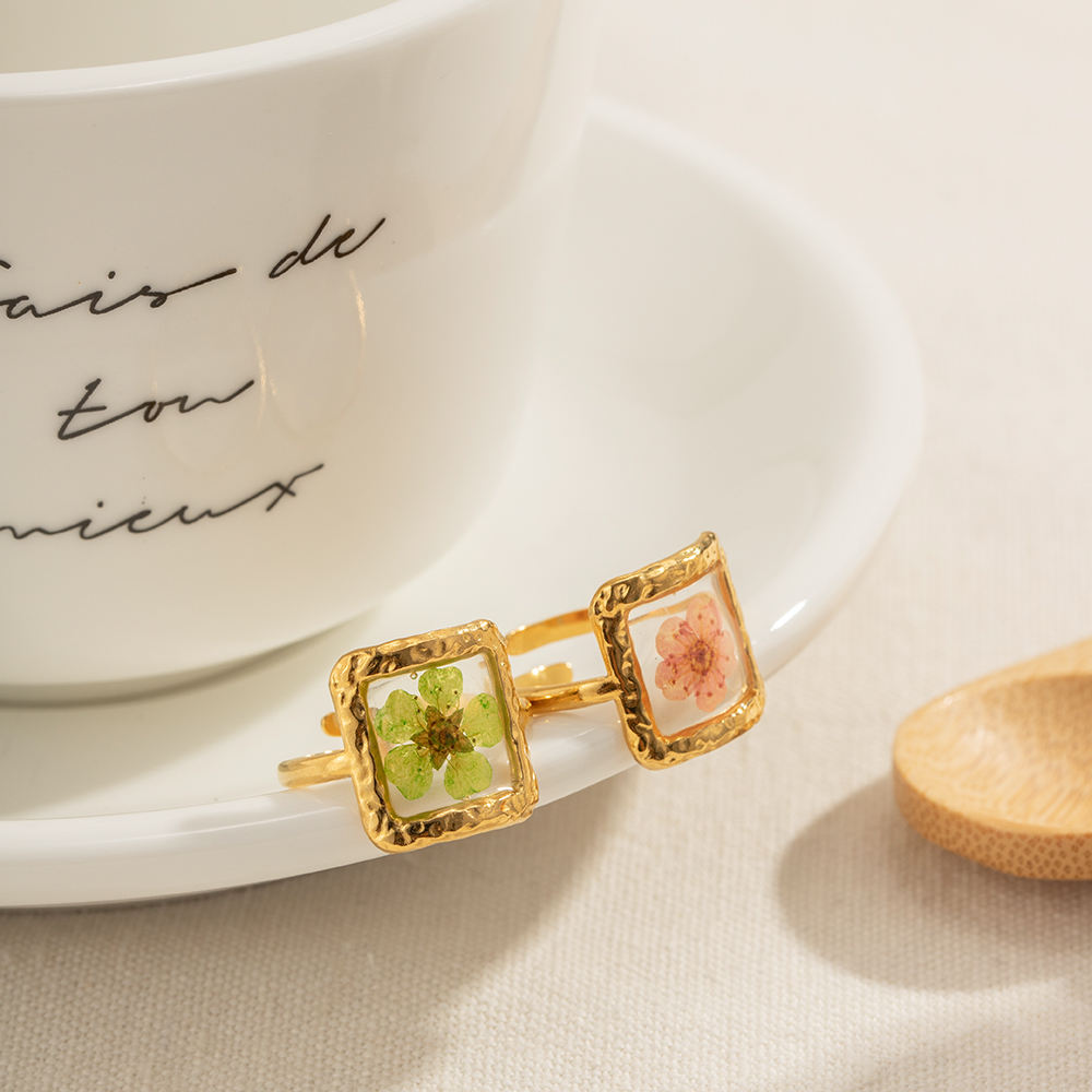 This dainty square ring beautifully encases a real colorful eternal plum flower, adding a playful yet elegant touch to your look. Perfect for gifting or enhancing everyday outfits with a subtle romantic charm.